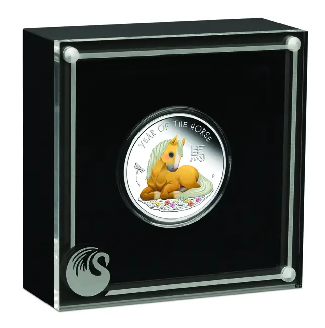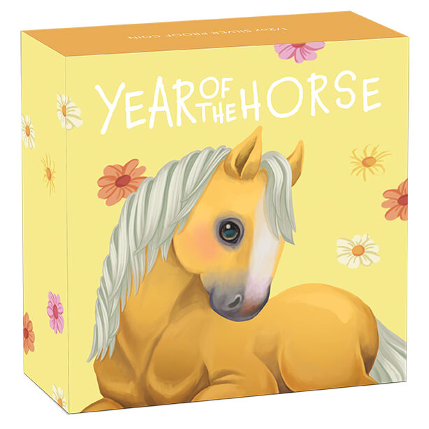 На обратната страна на монетата е изобразено цветно изображение на щастливо младо конче, почиващо на трева,украсена с нежни цветя, над които лети водничка. Китайският йероглиф за „кон“, надписът „ГОДИНА НА КОНЯ“ и знакът на монетния двор в Пърт „P“ също са включени в дизайна. Теглото, пробата, номиналната стойност и годината 2026 са изписани на лицевата страна на монетата, заедно с образа на Негово Величество крал Чарлз III, изработен от Джоди Кларк.