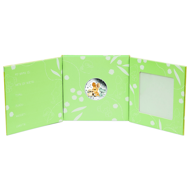 Цветната монета изобразява илюстрации на любимите бебешки животни в Австралия, пухкаво малко кенгуру, закачлива кукабура и сладка коала. Тя пристига при вас в красива сгъваема картичка, която предлага пространство за писане на пожелания за бебето и място за поставяне на снимка, което я прави красив и незаменим спомен от великия ден. Меките и неутрални цветове на обложката, я правят перфектен подарък както за момичета, така и за момчета.