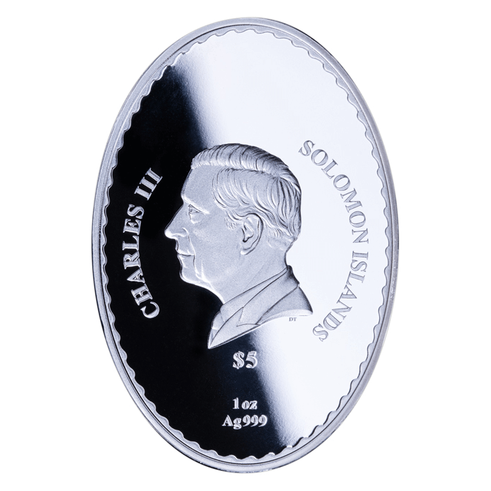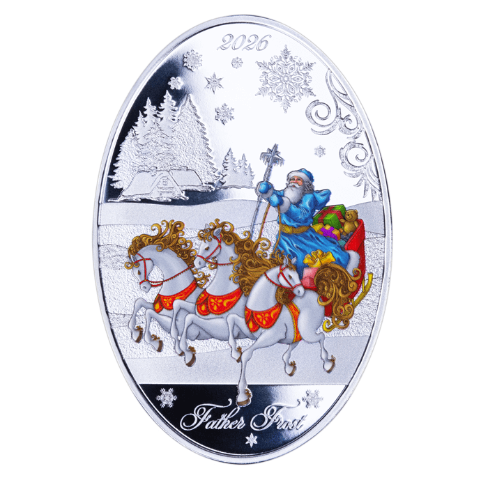 Тази внушителна сребърна монета от 1 унция шепне магията на зимата. Дядо Мраз препуска през снега. Три благородни коня препускат по замръзналата земя. Осветени от цветни искри, като празнични светлини върху свеж сняг. Ароматът на бор се носи във въздуха, докато снегът потапя света в свещена тишина. Овален фрагмент от празничната магия. Индивидуално номерирана. Монетата е запечатана в празнична дървена кутия- Матрьошка в два размера и със сертификат за автентичност. Ограничен тираж от 5000 броя в целия свят.