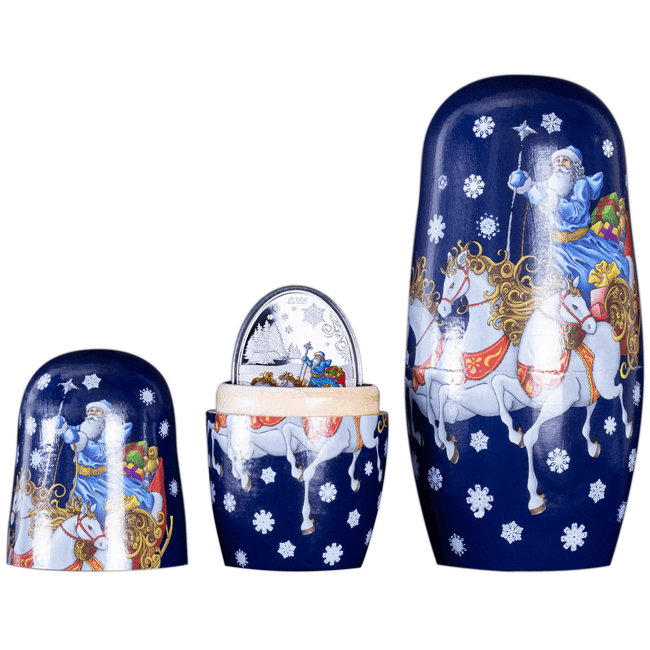 Уловете духа на Коледа с тази красива монета от 1 унция чисто сребро, посветена на Дядо Коледа. Отварянето е голяма част от изживяването, тъй като монетата се предлага в комплект от рисувани дървени кукли Матрьошка.