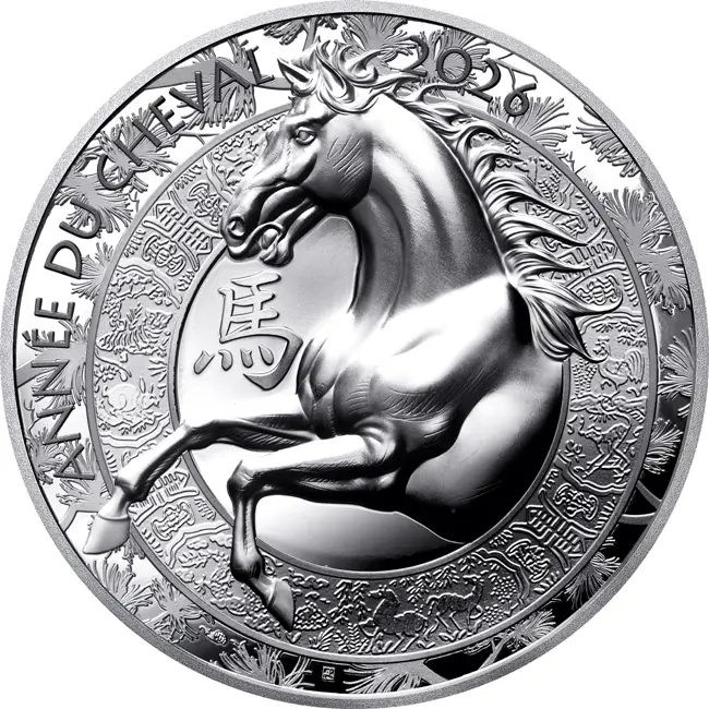 Енергичният Кон е животното от лунния зодиак през 2026 г. Той обещава смели действия, амбиция и огнена харизма. Тази сребърна монета отсечена от Monnaie de Paris с висок релеф изобразява това страстно създание.| Чисто тегло | 31.1 г |