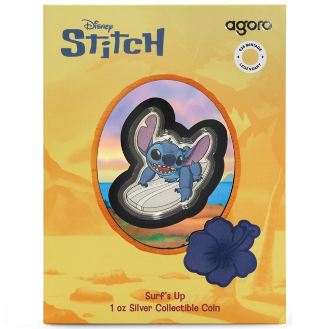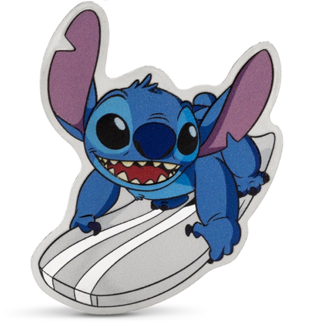 Внимателно изработената сребърна монета Stitch, изобразява зашеметяващ цвят, улавяйки енергичния му дух, докато сърфира с чисто вълнение.