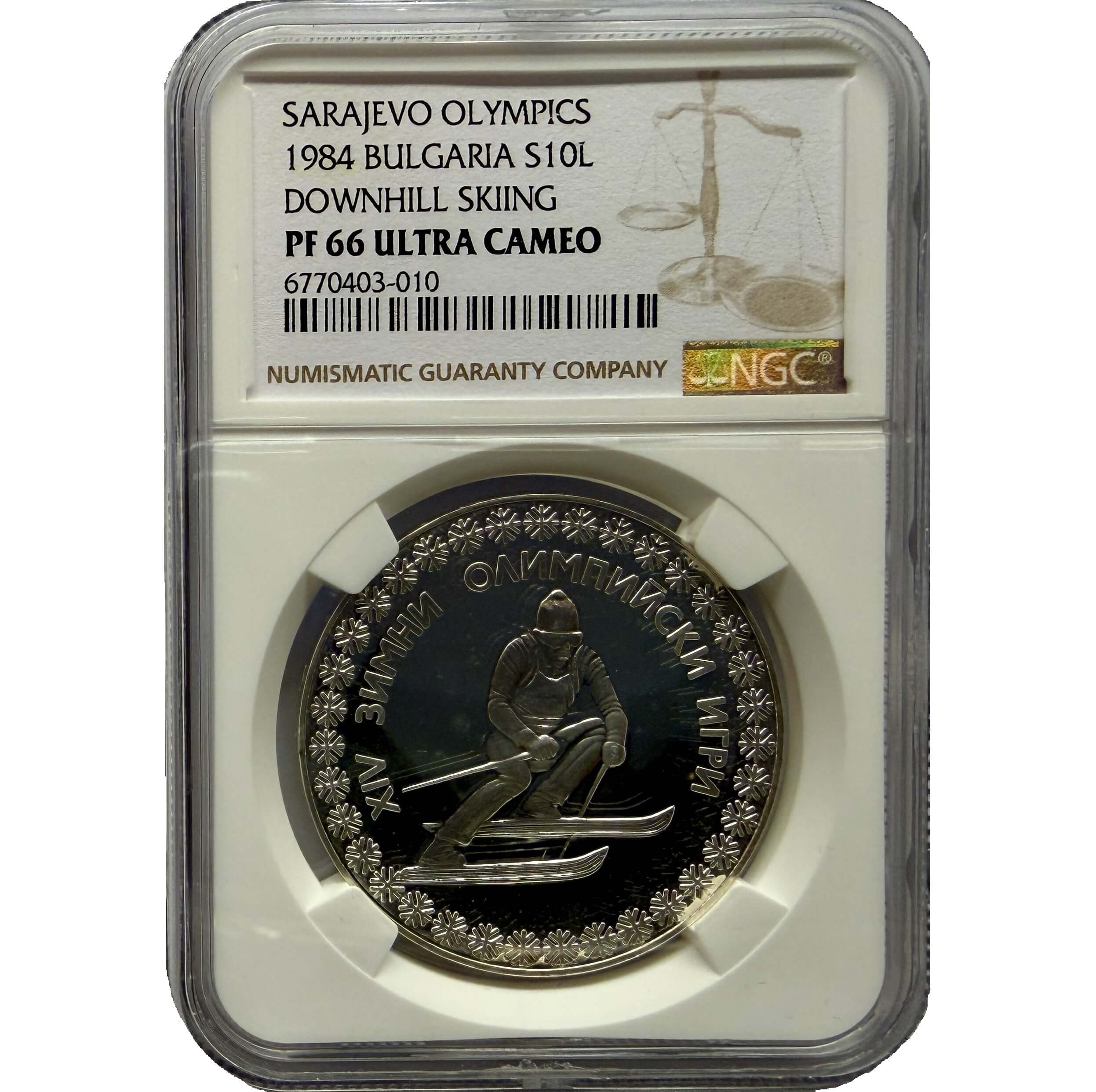 На лицевата страна на монетата в горната част е разположен държавният герб на Народна република България, под него е числото на номиналната стойност „10” с факли от двете му страни. Околовръст във външен пръстен са изписани: годината на емисия „1984”, надписите „НАРОДНА РЕПУБЛИКА БЪЛГАРИЯ” и „ЛЕВА”, а композицията завършва кант от снежинки.