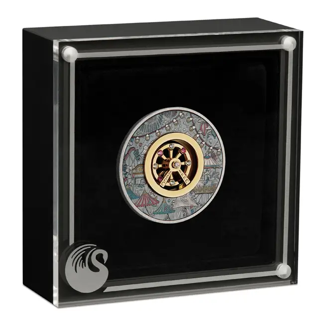 Тази изключителна сребърна монета от 2 унции вплете силата на човешките ръце в тъканта на великолепието на света. Представено за първи път на Световното изложение в Колумбия през 1893 г., виенското колело се издигна като стоманена мечта на фона на небето над Чикаго. Това беше предизвикателният отговор на Джордж Вашингтон Гейл Ферис-младши на Айфеловата кула. Тълпите ахнаха. Сърцата забиха по-бързо. Вятърът целуваше лицата им на невероятни височини. В сърцевината на монетата се върти вечно коелото. Блестяща с многоцветни кристали Сваровски. Скъпоценно ехо от първия поглед към света отвисоко. Монетата е ръчно обработена в античен стил и носи отпечатъка на времето. Тя е запечатана в класическа витрина с прозрачен капак. Придружена е от сертификат за автентичност. Само 2000 броя в света.