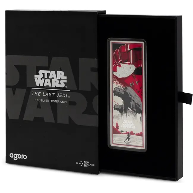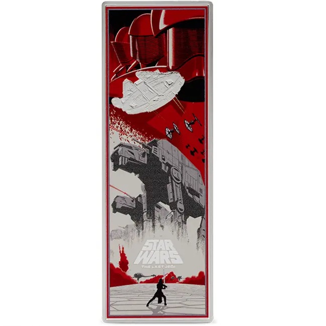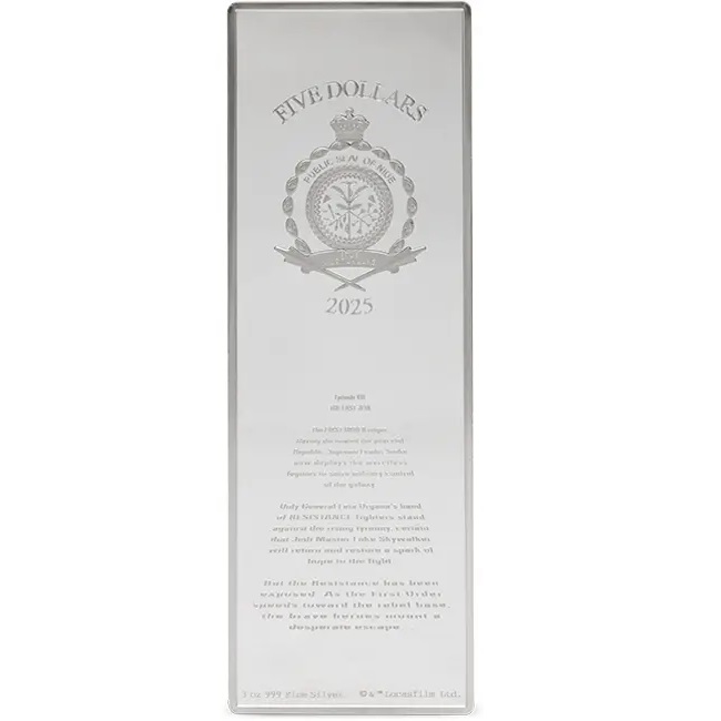 Тази зашеметяваща монета от 3 унции празнува емблематичния филм „Междузвездни войни: Епизод VIII Последният Джедай“. Лицевата страна показва Обществения печат на Ниуе, заедно с надписите: „ПЕТ ДОЛАРА“ – номиналната стойност, „2025“ – годината на издаване, теглото на монетата и фиността на среброто. Освен това е гравиран така нареченият „начален пълзящ текст“, който минава през екрана в началото на филма. Монетата е оформена в уникален правоъгълен формат и подчертава ярките цветове, използвани в оригиналния дизайн на филмовия плакат. Доставя се в оригинална кутия, включваща номериран сертификат за автентичност.