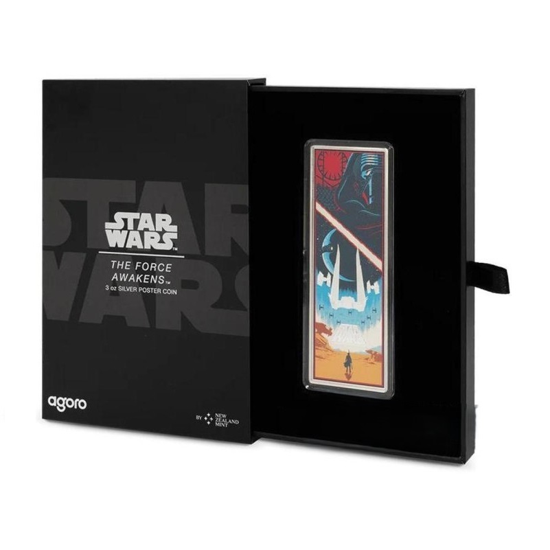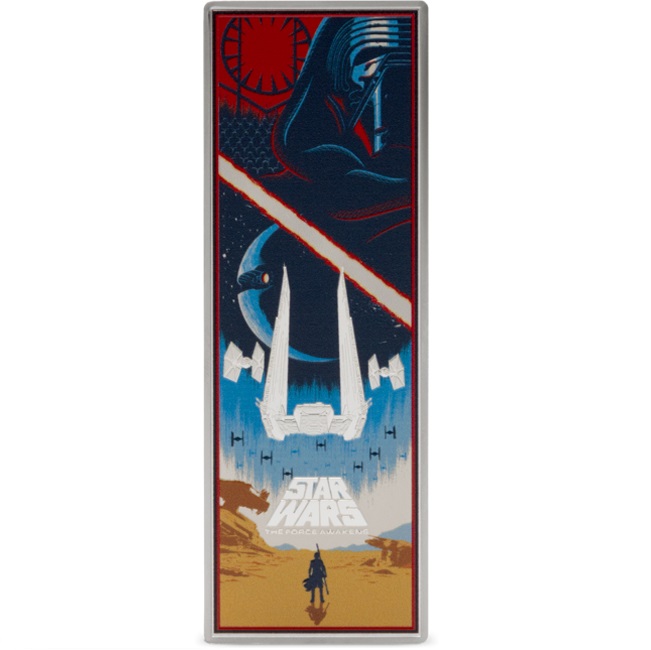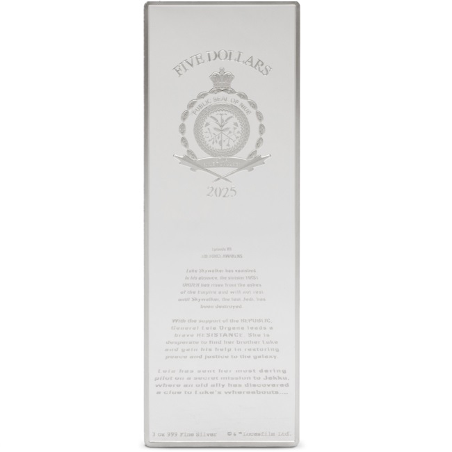 Тази зашеметяваща монета от 3 унции празнува емблематичния филм „Междузвездни войни: Епизод VII Силата се Пробужда“. Лицевата страна показва Обществения печат на Ниуе, заедно с надписите: „ПЕТ ДОЛАРА“ – номиналната стойност, „2025“ – годината на издаване, теглото на монетата и фиността на среброто. Освен това е гравиран така нареченият „начален пълзящ текст“, който минава през екрана в началото на филма. Монетата е оформена в уникален правоъгълен формат и подчертава ярките цветове, използвани в оригиналния дизайн на филмовия плакат. Доставя се в оригинална кутия, включваща номериран сертификат за автентичност.