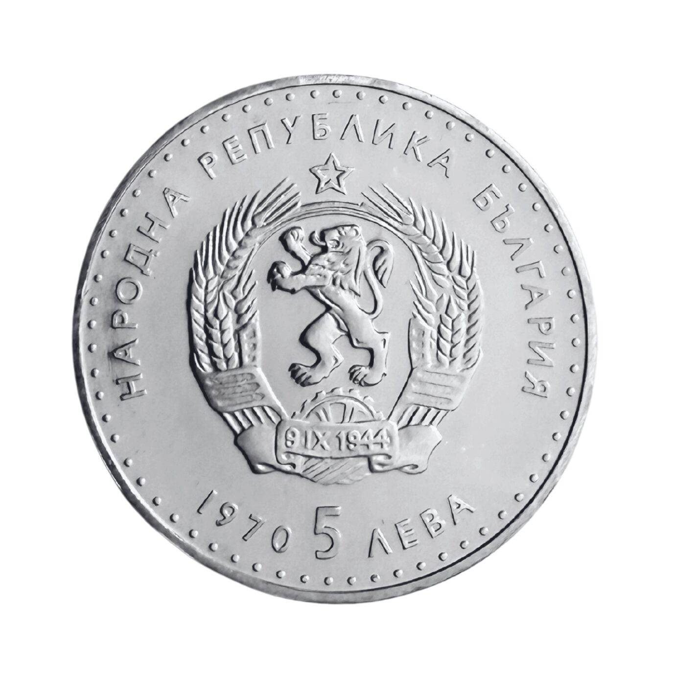 На лицевата страна на монетата в средата е разположен държавният герб на Народна република България. Околовръст има надписи „НАРОДНА РЕПУБЛИКА БЪЛГАРИЯ”, годината на емисия „1970“ и номиналната стойност „5 ЛЕВА”. Композицията завършва със зрънчест кръг.