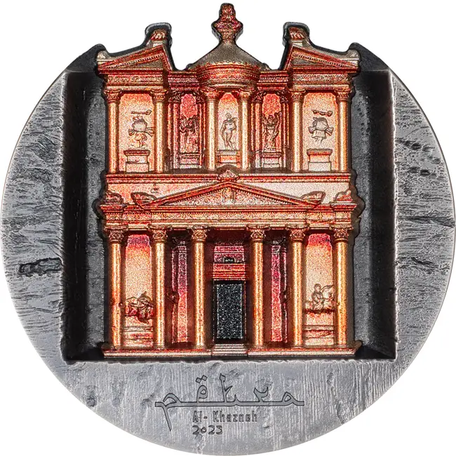 В почитат на едно от най-емблематичните археологически чудеса в света. Като първо издание от поредицата, празнуваща легендарните забележителности, тази монета отдава почит на Петра, древния град, издълбан в пясъчни скали в Южна Йордания. Изработена от 5 унции чисто сребро тя се отличава с 50 мм диаметър, богато антично покритие и ярко оцветен детайл.