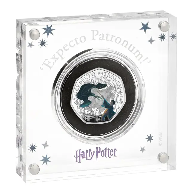 Представена в акрилен блок, тази сребърна монета е перфектният колекционерски предмет за феновете на популярния филм за Harry Potter.